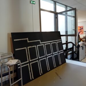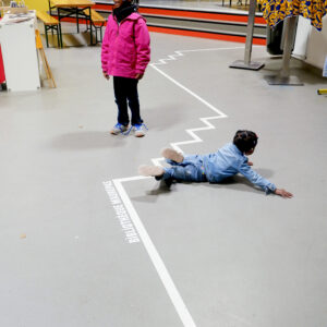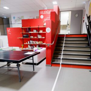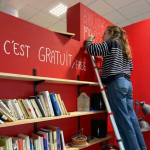 - • Peinture d’une ligne blanche au sol pour guider les passant•es depuis la porte d’entrée et jusqu’à la bibliothèque,