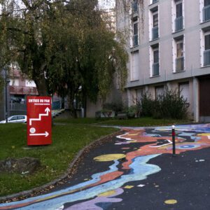 - • Création et pose de stickers à l’extérieur du bâtiment pour accompagner les passant•es jusqu’aux entrées adaptées à leurs besoins (ascenseur, escaliers, bibliothèque…)