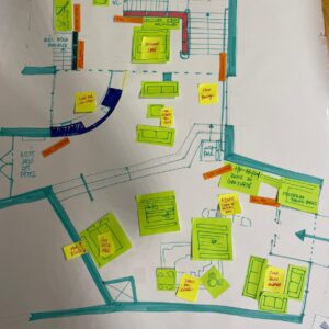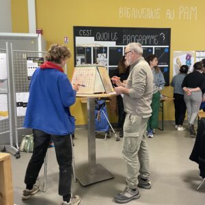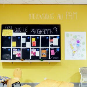 Juin 2025, le PAM a besoin d’un petit coup de pouce pour aider les visiteur•ices à se repérer pour accéder au bâtiment associatif, mais aussi pour se repérer une fois rentré ! Cette demande fait suite à une modification des accès au bâtiment, elle a pour but d’aider les personnes à trouver plus facilement les associations et la bibliothèque qui se nichent dans le bâtiment. On commence par un temps de “permanence” dans le bâtiment, accompagnées de notre Ambiançomètre, pour comprendre son fonctionnement, les flux de personnes et le calendrier bien chargé d’activités du PAM. Diagnostic : un bâtiment à plusieurs niveaux, plusieurs accès, rempli d’une multitude d’assos, d’une bibliothèque de quartier, avec des années de supports de communication visuelle superposées : pas facile pour tout le monde de s’orienter !